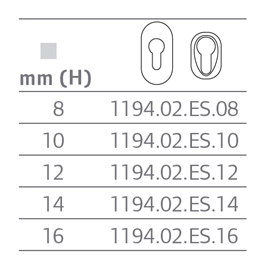 Heights (H) available: 8, 10, 12, 14, 16 mm. Fixing centres 20 mm, no visible screws, for outside cylinder. Escutcheon for inside cylinder, 65x30x4 mm. Fixing centres 20 mm